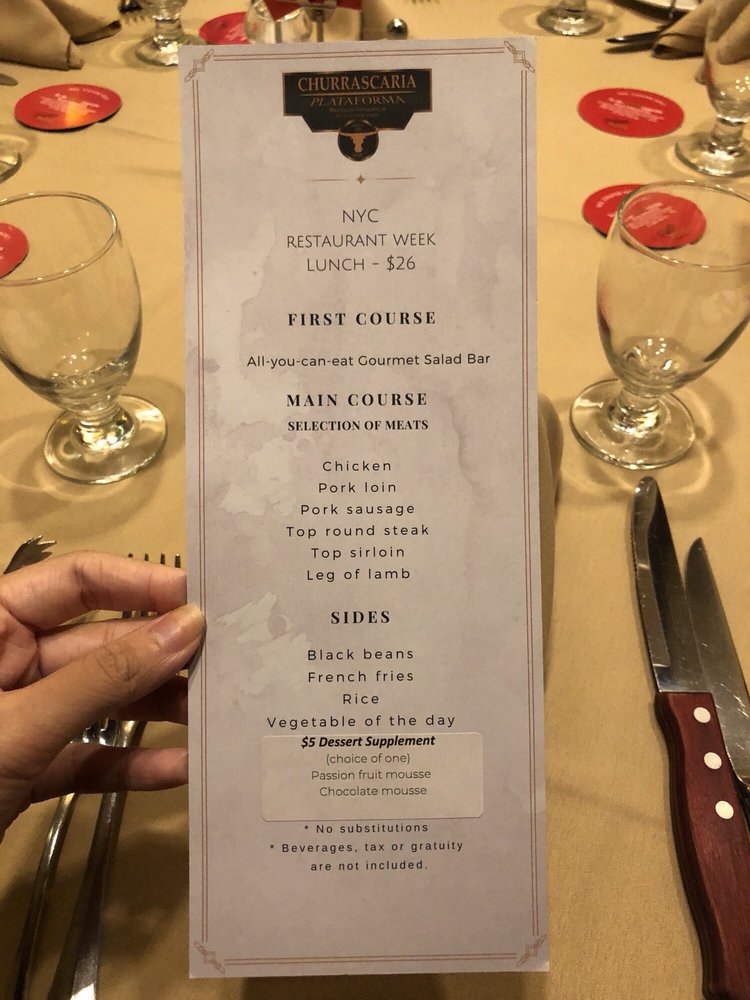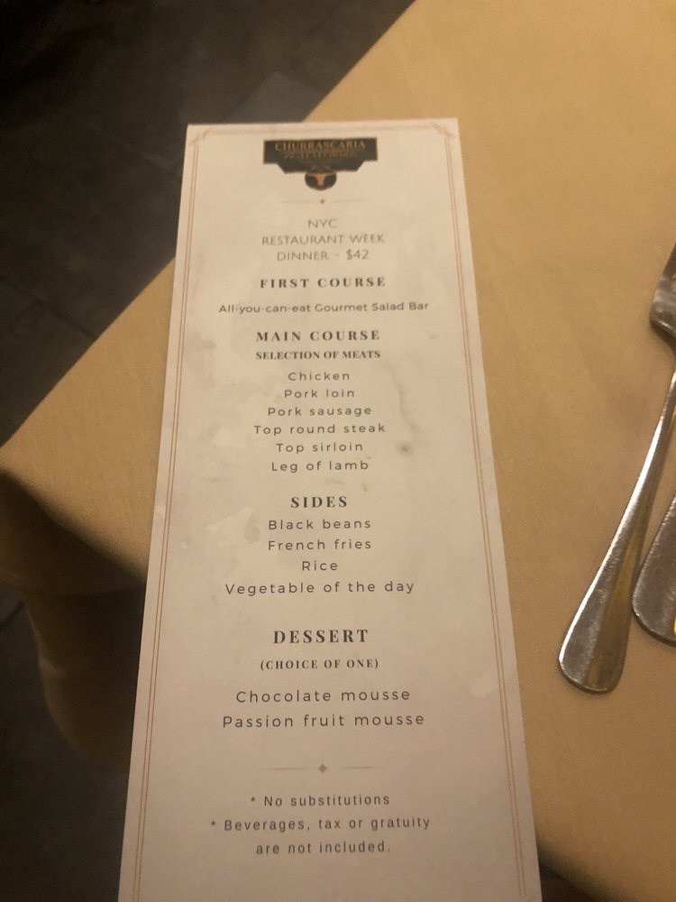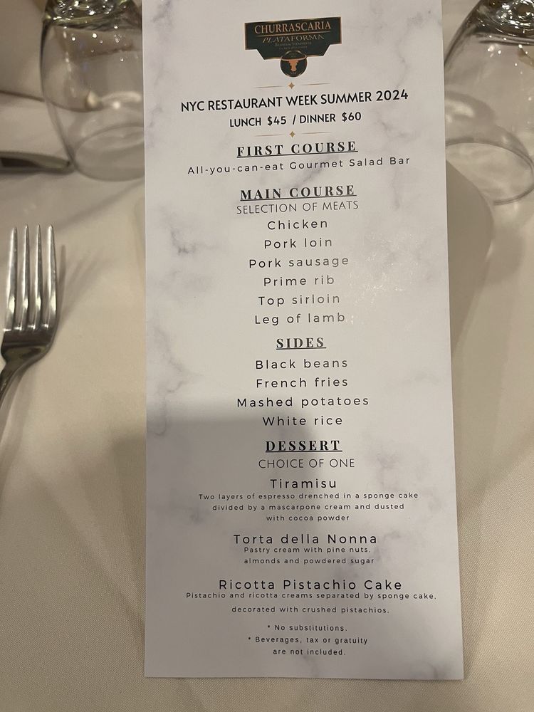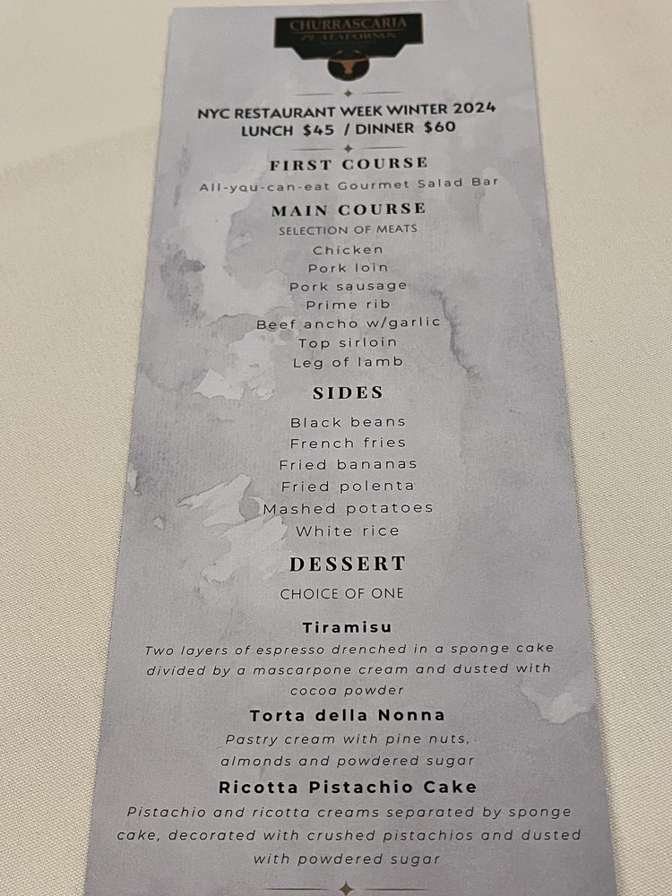 Rodizio style lunch: all-you-can-eat Gourmet salad bar, selection of meats (chicken, pork loin, pork sausage, prime rib, beef ancho with garlic, top sirloin, leg of lamb), sides (black beans, french fries, fried bananas, fried polenta, mashed potatoes, white rice), dessert (choice of one): tiramisu, torta della nonna, ricotta pistachio cake.