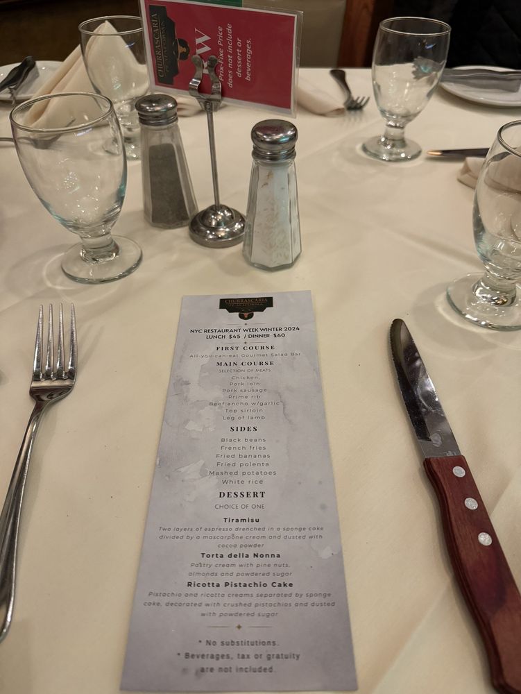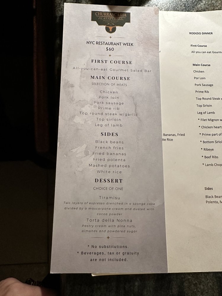 Rodizio style dinner: all-you-can-eat Gourmet salad bar, selection of meats (chicken, pork loin, pork sausage, prime rib, beef ancho with garlic, top sirloin, leg of lamb), sides (black beans, french fries, fried bananas, fried polenta, mashed potatoes, white rice), dessert (choice of one): tiramisu, torta della nonna, ricotta pistachio cake.
