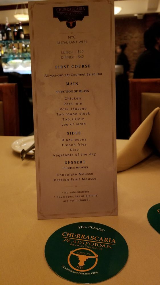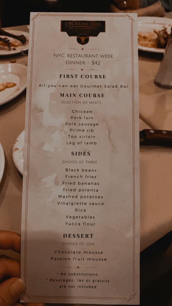 Churrascaria, a Brazilian steakhouse located in New York City, offers an extensive menu with a variety of options for different dietary preferences, including Keto, Pescatarian, Vegan, and Vegetarian. The restaurant boasts a classy yet casual atmosphere with excellent service and a diverse range of amenities such as complimentary Wi-Fi, a full bar, and outdoor seating. Customers rave about the delicious meats, including filet mignon, beef sirloin, and lamb, all prepared to perfection. The salad bar is a highlight, featuring a variety of fresh and flavorful options. The restaurant also offers happy hour specials and live music in the evenings. Overall, Churrascaria provides a fine dining experience with top-notch food and a welcoming ambiance that keeps customers coming back for more.